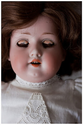 Na początek zdemontowałam lalkę, odkleiłam perukę i wyjęłam jej oczy. Miałam zamiar jakoś reanimować jej powieki, ale po wyjęciu oczu dosłownie rozsypały mi się rękach. Peruka z kolei okazała się całkiem dobrze zrobiona, więc postanowiłam dać jej szansę (jeżeli mój plan by nie wypalił miałam zamiar sama wykonać dla niej perukę). Potem wyczyściłam całe ciałko z pomocą magicznej gąbki, wolałam nie używać detergentów aby nie uszkodzić skórzanego materiału, ale już takie czyszczenie zdjęło spore pokłady brudu, które nagromadziły się na tej lalce. Następnie zabrałam się za butki. Odkleiłam starą podeszwę i wykonałam nową z cienkiej balsy. Potem przyszła kolej na perukę. Z pomocą wrzątku, szamponu i odżywki udało mi się przywrócić im dawny blask :) Początkowo chciałam je na nowo pokręcić, jednak stwierdziłam, że mało antycznych lalek ma proste włosy i postanowiłam zostawić je w takim stanie. Potem zabrałam się za powieki i tutaj napotkałam schody. Jak i z jakiego materiału je wykonać? Okazuje się niestety, że internet i YT pełne są filmików z kotkami, ale nie ma ani jednego video odnośnie naprawiania/tworzenia nowych powiek dla lalek antycznych :( Nie pozostawało mi nic innego jak samej wykminić jak je wykonać. Na początku użyłam masy epoxy, jednak okazało się, że musiałabym nałożyć bardzo cienką warstwę, bo gdy było za dużo materiału to potem nie działał mechanizm oczu i blokował się na zbyt grubych powiekach. Wtedy wpadłam na pomysł, aby wykonać powieki warstwowo z papieru aby były one odpowiednio cienkie. To rozwiązanie okazało się lepsze i po dodaniu nowych rzęsek wyglądały całkiem dobrze :) Na końcu zabrałam się za makijaż. Początkowo chciałam jedynie przywrócić lalkę do stanu jak najbliżej jej pierwotnego wyglądu bez znacznej ingerencji w makijaż. Jednak z drugiej strony patrząc na nią zauważałam mankamenty jej makijażu- niechlujnie namalowane rzęsy, niesymetryczne brwi, niedomalowane usta... Nie po to mam umiejętności w malowaniu lalek aby zostawić takie niedoróbki :) Aby poprawić jej wygląd na początek musiałam zedrzeć jej dotychczasowe rzęsy, w dosłownym tego słowa znaczeniu. Każda osoba która zajmuje się odrestaurowaniem lalek teraz pewnie łapie się za głowę, bo tak de facto to tak, zniszczyłam jej makijaż oraz zdarłam frezarką nieco podkładu aby pozbyć się tych czarnych kresek. Jednak wiedziałam, że takie rzeczy spokojnie da się zatuszować makeupem i po namalowaniu nowych rzęs nie będzie widać tak drastycznej ingerencji. Po wykonaniu makijażu zostało mi już tylko dobrać jej odpowiednie ciuszki i tak powstała moja wiktoriańska dama :) Nadałam jej na imię Claudia (w nawiązaniu do postaci z Wywiadu z wampirem :)).